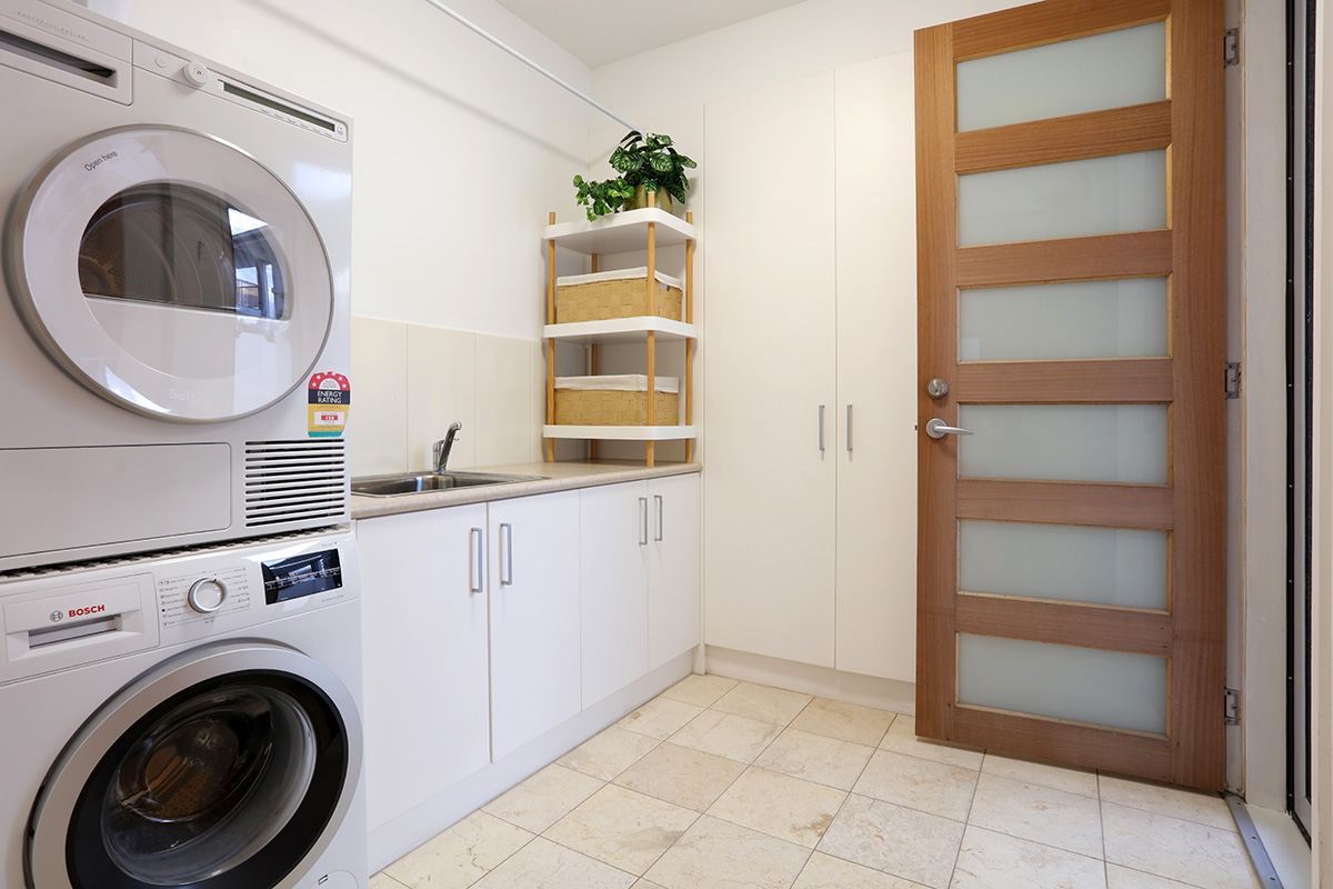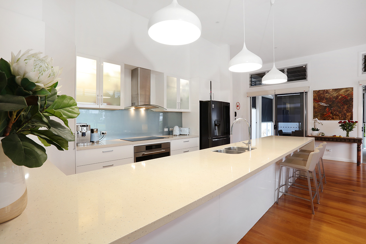 The modern and practical galley kitchen features a massive 5-metre long stone bench top with European appliances, and is spacious and functional in its design and a real centrepiece of the home.