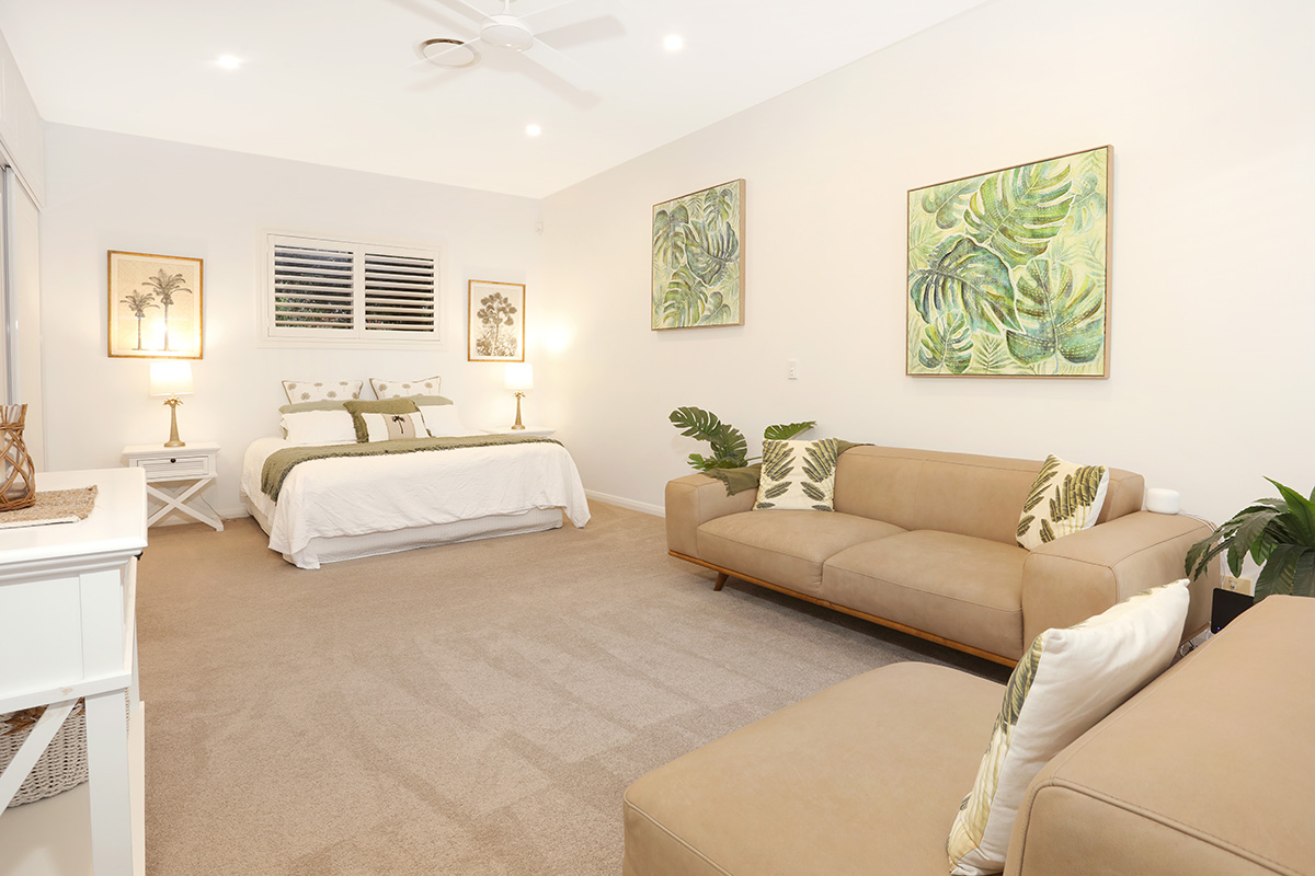 The open plan living area with soaring 3.5 metre ceilings and timber flooring boasts fantastic golf course views and combines the main living/dining and the very impressive and functional kitchen areas together, creating an inviting warm and family orientated atmosphere. Large sliding doors on either side of this area open out onto both front and side balconies, making it the perfect space for entertaining larger numbers of guests.